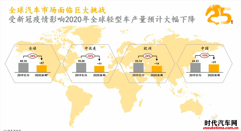 受新冠疫情影响,全球汽车市场正面临严峻挑战。大陆集团预计,2020年全球轻型车产量较2019年或同比下滑24%至6700万辆。中北美市场产量或同比下滑32%,欧洲市场产量或同比下滑24%。中国市场的轻型车生产状况相对好一些,2020年或同比下滑15%至2100万辆。